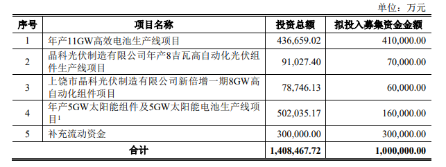 公告顯示,晶科能源本次募投項目包括年產(chǎn)11GW高效電池生產(chǎn)線項目、晶科光伏制造有限公司年產(chǎn)8GW高自動化光伏組件生產(chǎn)線項目、上饒市晶科光伏制造有限公司新倍增一期8GW高自動化組件項目、年產(chǎn)5GW太陽能組件及5GW太陽能電池生產(chǎn)線項目,并補充流動資金。