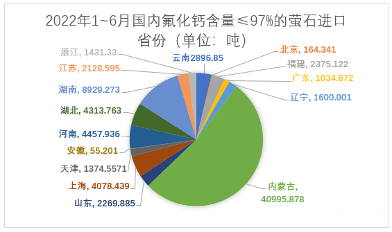 2022年1~6月,國內(nèi)按重量計氟化鈣含量>97%的螢石總進口量為19401.710噸。主要進口國家:墨西哥12248.236噸、緬甸7138.230噸。