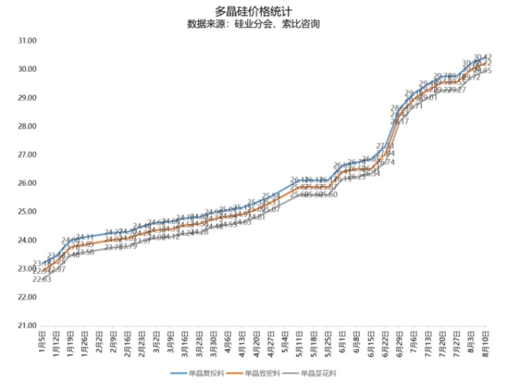 中國粉體網訊 8月10日,中國有色金屬工業協會硅業分會公布了太陽能級多晶硅最新價格。