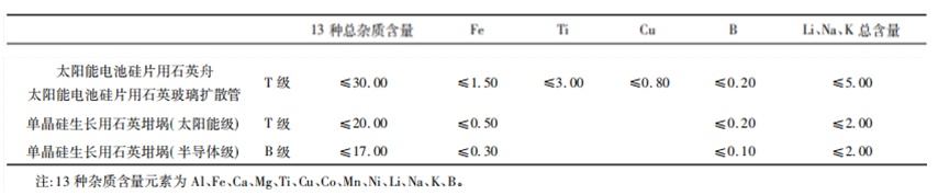 太陽能石英坩堝是光伏產業所用的消耗品,是拉大直徑單晶和多晶硅制品的消耗性容器,使用溫度大約1500℃并且使用次數只有一次。我國出臺了一系列的行業標準《太陽能電池硅片用石英舟》《太陽能電池硅片用石英玻璃擴散管》。太陽能電池硅片用石英舟、石英玻璃擴散管應滿足T級產品的質量要求,如下表所示。