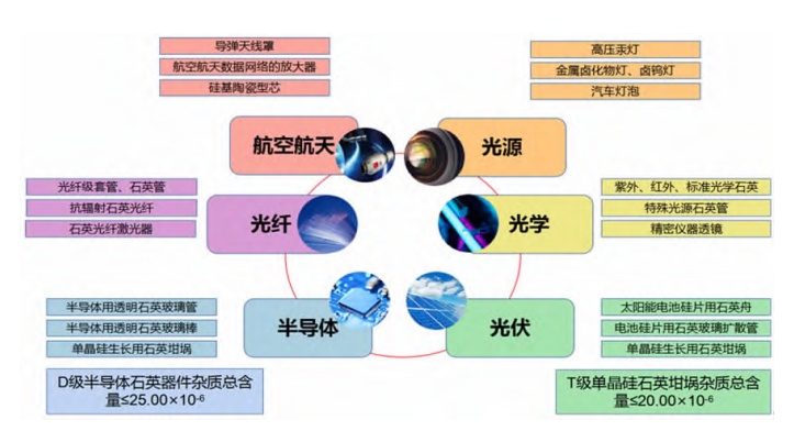 高純石英根據其含量不同,應用領域也不同,其中含量為99.5%~99.99%為光源行業,含量高于99.99%用于高端光學器件、激光器件,含量為99.995%~99.9999%用于半導體、光伏等產業。