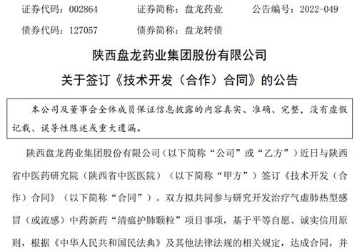 中國粉體網(wǎng)訊 陜西盤龍藥業(yè)集團(tuán)股份有限公司(“公司”)近日與陜西省中醫(yī)藥研究院(陜西省中醫(yī)醫(yī)院)簽訂《技術(shù)開發(fā)(合作)合同》(“合同”)。雙方擬共同參與研究開發(fā)治療氣虛肺熱型感冒(或流感)中藥新藥“清瘟護(hù)肺顆粒”項(xiàng)目事項(xiàng),基于平等自愿、誠實(shí)信用原則,根據(jù)《中華人民共和國民法典》及其他法律法規(guī)的相關(guān)規(guī)定,達(dá)成合同,并由雙方共同恪守。