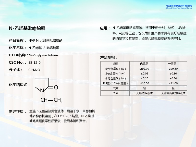 N-乙烯基吐咯烷酮化學性質活潑,極易水解和聚合。