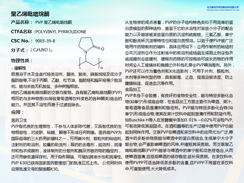 極易溶于水及含鹵代烴類溶劑、醇類、胺類、硝基烷烴及低分子脂肪酸等,不溶于丙酮、乙醚、松節油、脂肪烴和脂環烴等少數溶劑。能與多數無機酸鹽、多種樹脂相容。 純的乙烯基吡咯烷酮的交聯均聚物。具有聚乙烯吡咯烷酮(PVP)相厲的與多種物質(如導致葡萄酒等飲料變色的各種醐類)絡合的能力。并因其不溶性而易于過濾后除去。