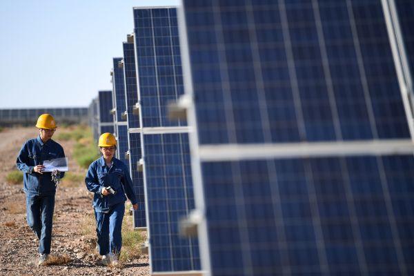 光伏電站工作人員在甘肅省金昌市華能集團西坡光伏電站現場巡檢(新華社發)