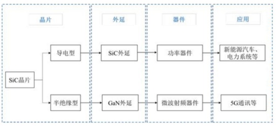 碳化硅半導體產業鏈可分為三個環節:分別是上游襯底,中游外延片和下游器件制造。碳化硅在半導體中存在的主要形式是作為襯底材料。碳化硅晶片作為半導體襯底材料,長晶難度大,技術壁壘高。