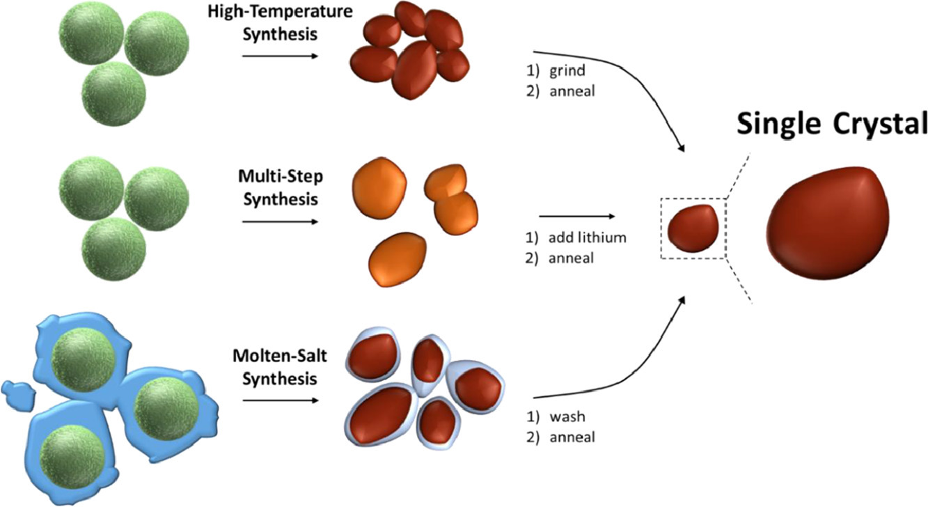 Langdon等在其綜述性文章《A perspective on single-crystal layered oxide cathodes for lithium-ion batteries》中總結(jié)了單晶的3種主要合成方法,如下圖所示,分別為高溫煅燒法、多步煅燒法和熔鹽法。