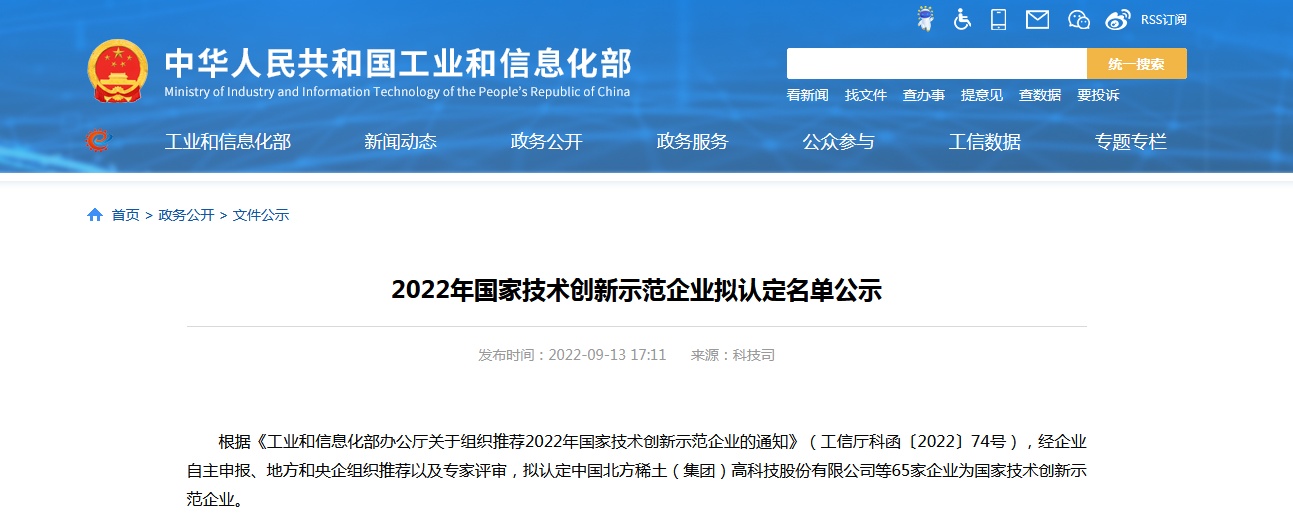 中國粉體網(wǎng)訊 近日,工信部科技司發(fā)布公告,根據(jù)《工業(yè)和信息化部辦公廳關(guān)于組織推薦2022年國家技術(shù)創(chuàng)新示范企業(yè)的通知》(工信廳科函〔2022〕74號(hào)),經(jīng)企業(yè)自主申報(bào)、地方和央企組織推薦以及專家評(píng)審,擬認(rèn)定中國北方稀土(集團(tuán))高科技股份有限公司等65家企業(yè)為國家技術(shù)創(chuàng)新示范企業(yè)。