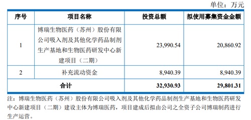 “博瑞生物醫藥(蘇州)股份有限公司吸入劑及其他化學藥品制劑生產基地和生物醫藥研發中心新建項目(二期)”有助于進一步擴充公司吸入制劑產能和豐富吸入制劑產品種類。同時通過本次募集資金投資項目建設,有助于發揮公司在高端仿制藥領域的技術優勢,促進研發成果產業化,有助于公司在自身高技術壁壘的醫藥中間體、原料藥和制劑產品研制業務的基礎上,逐步建立原料藥與制劑一體的業務體系。