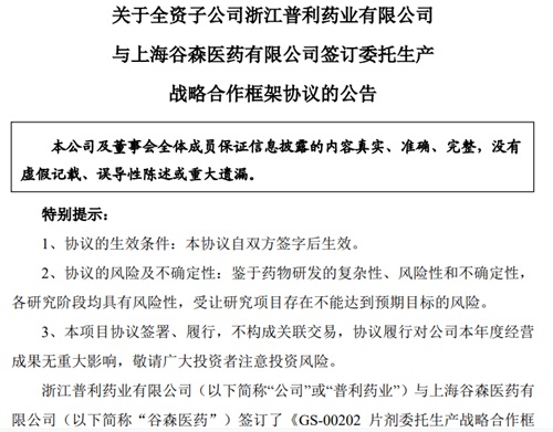 中國粉體網訊 9月13日,普利制藥發布公告,子公司浙江普利藥業有限公司(“浙江普利藥業”)與上海谷森醫藥有限公司(“谷森醫藥”)簽訂了《GS-00202片劑委托生產戰略合作框架協議》協議,雙方本著“平等自愿、資源共享、優勢互補、協同發展”的原則開展合作,谷森醫藥作為GS-00202片劑項目的藥品上市許可持有人(MAH),雙方同意建立長期合作,利用普利藥業符合歐美及國內cGMP固體制劑生產體系優勢,為谷森醫藥面向國內外市場的臨床批、驗證批和商業批提供片劑的委托生產服務。