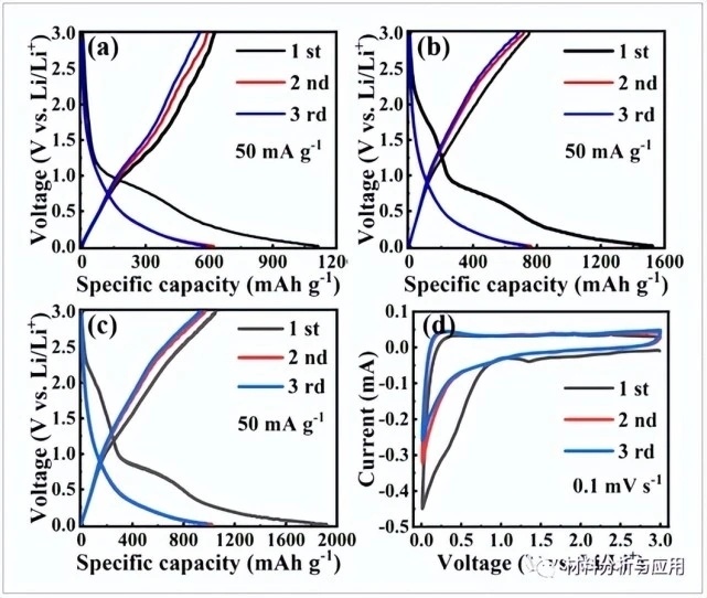圖3 (a)LRK-6、(b)LRK-8和(c)LRK-7的前三個放電/充電電壓與比容量曲線;(d)LRK-7前三個循環(huán)在0.1mVs-1時的CV曲線