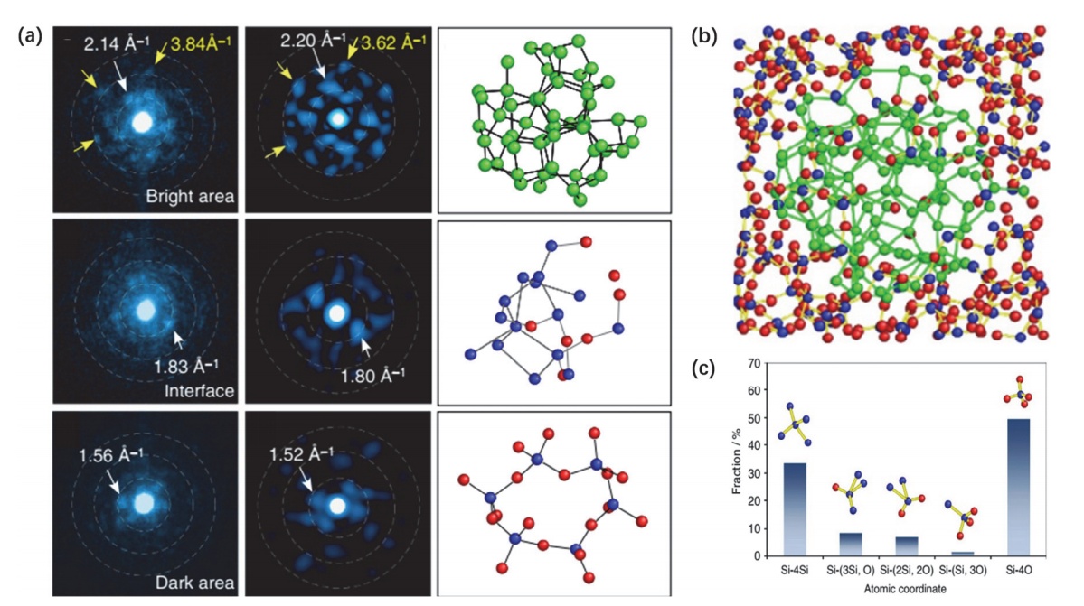 2016年,Chen等首次報道了非晶態SiO原子尺度不平衡的相關實驗證據,他們用埃束電子衍射(ABED),在Si/SiO2界面層檢測到對應SiOx四面體的坐標;根據ABED和同步輻射X射線散射結果,結合計算機模擬,該團隊提出了歧化型SiO的結構模型。