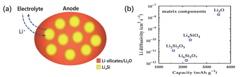 (a)SiO負極鋰化去鋰化過程示意圖;(b)SiO負極鋰化過程中產生的不同組分的Li+擴散率系數和容量關系圖(來源:朱思穎等,《鋰離子電池氧化亞硅負極結構優化和界面改性研究進展》)