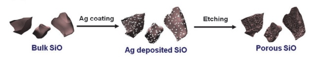 利用Ag催化刻蝕制備多孔SiO的過程示意圖(來源:朱思穎等,《鋰離子電池氧化亞硅負極結構優化和界面改性研究進展》)