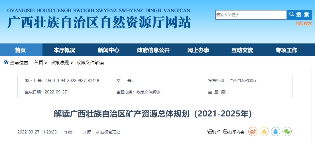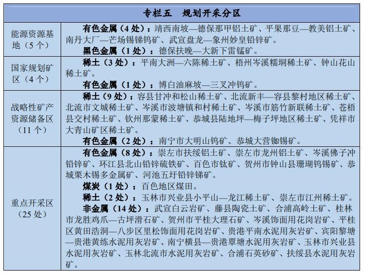 中國粉體網訊 9月27日,廣西自然資源廳印發了《廣西壯族自治區礦產資源總體規劃(2021-2025年)》(以下簡稱:《規劃》),并提出規劃目標:到2025年,全區礦產勘查開發布局和礦業結構進一步優化,礦山環境狀況顯著改善,資源節約與綜合利用達到全國先進水平,基本形成科學、有序、綠色、高效的礦產資源開發利用新格局。