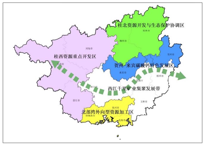 以礦產資源稟賦及開發利用狀況為基礎,積極促進形成“四區一帶”即“桂西資源重點開發區、北部灣外向型資源加工區、賀州—來賓碳酸鈣特色發展區、桂北資源開發與生態保護協調區和西江千里礦業集聚發展帶”的礦業發展總體布局,推動全區礦業差異化、特色化發展。