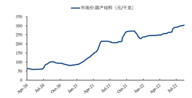 回顧近年來的硅料價格,數(shù)據(jù)顯示,2020年初以來,硅料價格從約70元/kg上漲至2022年三季度的303元/kg,累計漲超三倍,刷新近十年新高。