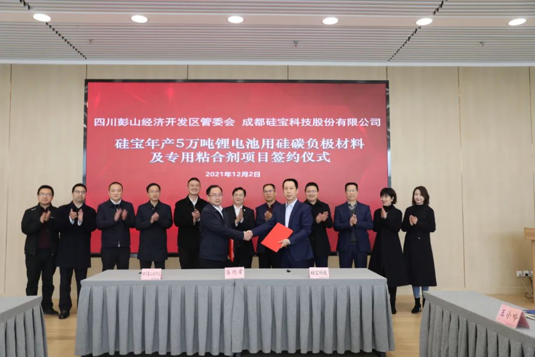 2021年12月2日,硅寶科技與四川彭山經(jīng)濟開發(fā)區(qū)就硅寶“5萬噸/年鋰電池用硅碳負極材料及專用粘合劑項目”正式簽約