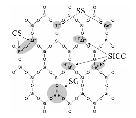 類似的還有Ti4+、B3+、P3+等雜質元素。可見,天然石英內部的雜質,特別是以類質同像狀態存在的雜質,直接制約著高純石英產品生產,當原礦Al、Ti、Li、B、P等雜質元素含量較高,就不易獲得高純石英。