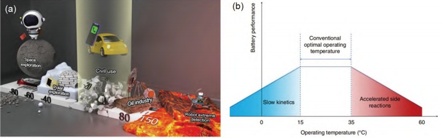 (a)鋰電池面臨的不同溫度的應用場景示意圖;(b)極端工作溫度對于電池帶來的影響(來源:戚世翰等,寬溫域鋰電池電解液研究進展)