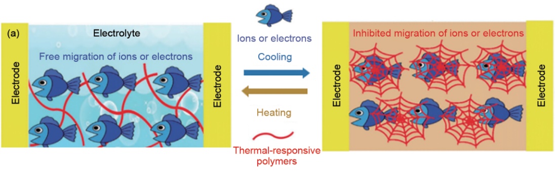 通過可逆的熱響應聚合物來抑制電極之間的離子或電子傳導以防止電化學存儲設備的熱失控(來源:歐宇等,鋰離子電池中的智能安全電解液研究進展)
