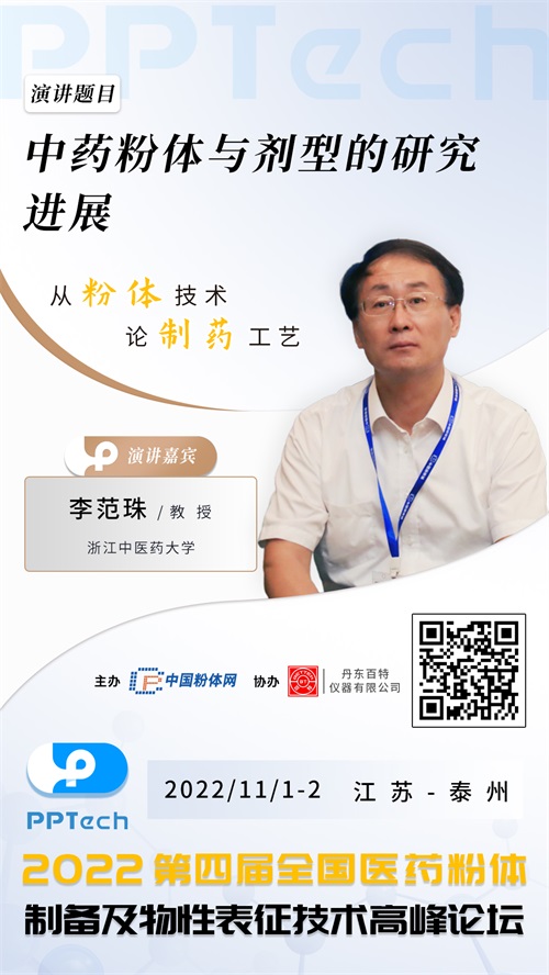 然而不可否認的是,中藥粉體自身存在的諸如粒徑差異大、混合不均、密度差異大而離析、易吸濕返潮、含量不均勻、口感不佳等制劑學缺陷會直接影響制劑質量,甚至導致一系列用藥安全隱患。為滿足廣大制藥企業及新老客戶對行業難題的破解需求,中國粉體網以“從粉體技術,論制藥工藝”為主題,將于2022年12月1-2日在江蘇泰州碧桂園鳳凰酒店舉辦“第四屆全國醫藥粉體制備及物性表征技術高峰論壇”,屆時邀請來自浙江中醫藥大學的李范珠教授作《中藥粉體與劑型的研究進展》報告,現場與大家分享中藥現代劑型發展現狀,并對中藥劑型現代化發展思路進行探討,同時為大家解答中藥粉體制劑相關的難題。