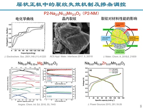 層狀氧化物由于具有高理論容量和高空氣穩(wěn)定性,被認為是一種應(yīng)用前景廣闊的高比能鈉離子電池正極材料,然而其實際應(yīng)用卻面臨諸多難題,比如高電壓下會發(fā)生P2到O2的大體積相變和不可逆的氧釋放,導(dǎo)致電池容量和電壓迅速衰減。為了改善材料的性能,來自北京工業(yè)大學(xué)的閆教授首先給我們講述了層狀正極材料中的裂紋失效機制,而通過元素摻雜(Mg摻雜、Zn摻雜)可改變正極材料的循環(huán)穩(wěn)定性,元素摻雜可形成納米沉淀相,通過穩(wěn)定沉淀相增強材料表面穩(wěn)定性。