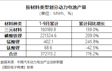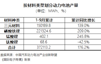 據中國汽車動力電池產業創新聯盟統計的數據顯示,1-9月,中國動力電池產量累計為372.1GWh,累計同比增長176.2%,其中三元電池累計產量150.2GWh,占總產量40.4%,同比累計增長139%;磷酸鐵鋰電池累計產量221.3GWh,占總產量59.5%,累計同比增長209%。