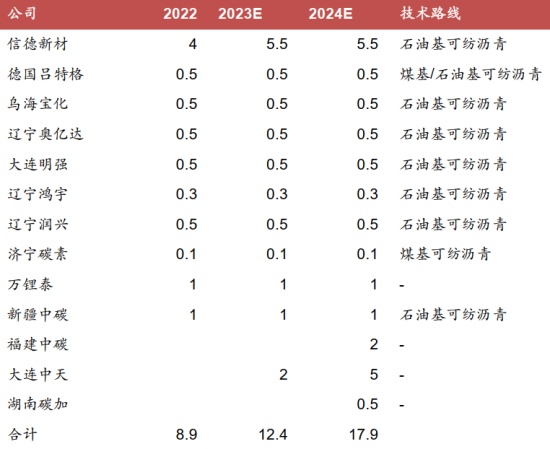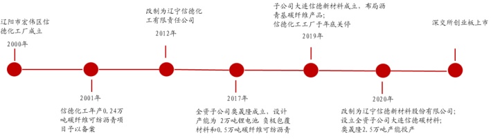 信德新材成立之初經營碳纖維可紡瀝青,工廠位于遼陽,產能0.24萬噸,已于2019年底關停。公司在大連下設三家全資子公司,公司于2017年在大連長興島設立的奧晨隆,其設計產能為2萬噸鋰電池負極包覆材料和0.5萬噸碳纖維可紡瀝青,2020年投產;公司于2019年成立大連信德新材料(于2020年6月變更為全資子公司),布局瀝青基碳纖維產品;公司于2020年成立大連信德碳材料,為IPO募投項目“年產3萬噸碳材料產業化升級建設項目”的實施主體,在擴大產能的同時,向上游延伸產業鏈至更易得的大宗商品乙烯焦油。