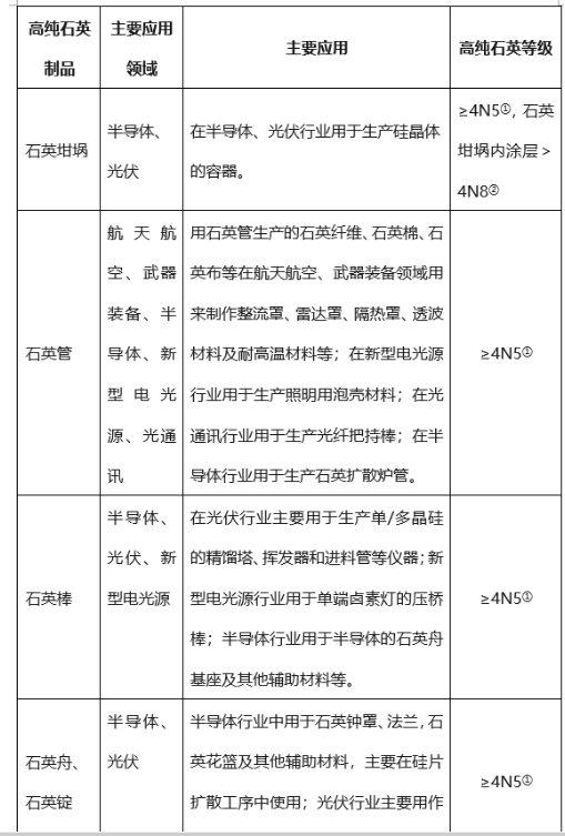 以高純石英為原料可生產(chǎn)石英玻璃坩堝、錠材、管材、棒材、板材、各種器皿和器件以及石英玻璃纖維和織物等產(chǎn)品。