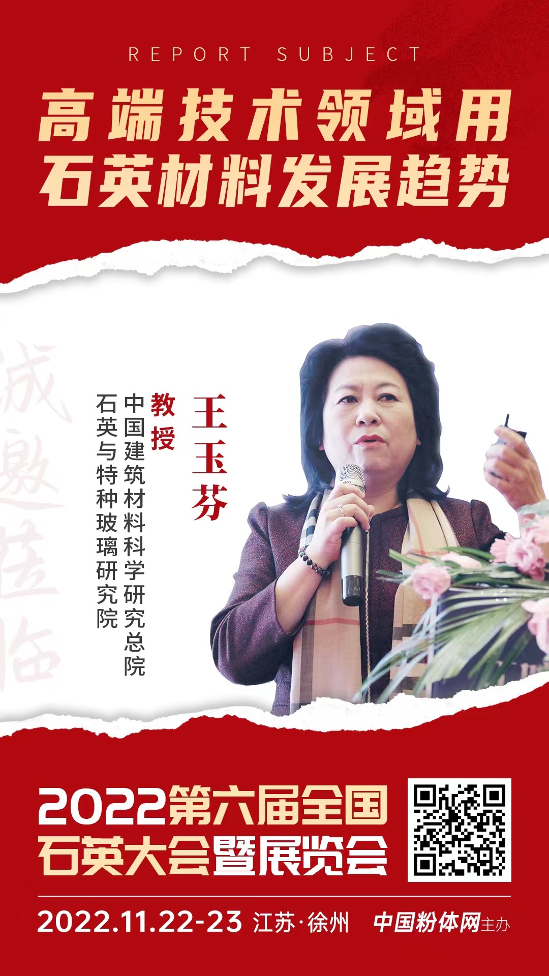 2022年11月22日至23日,中國(guó)粉體網(wǎng)將在江蘇徐州舉辦“2022第六屆全國(guó)石英大會(huì)暨展覽會(huì)”。來(lái)自中國(guó)建筑材料科學(xué)研究總院石英與特種玻璃研究院的王玉芬教授將帶來(lái)題為《高端技術(shù)領(lǐng)域用石英材料發(fā)展趨勢(shì)》的報(bào)告。
