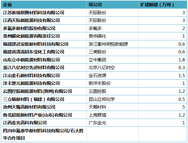 主要新建擴建產能統計列表