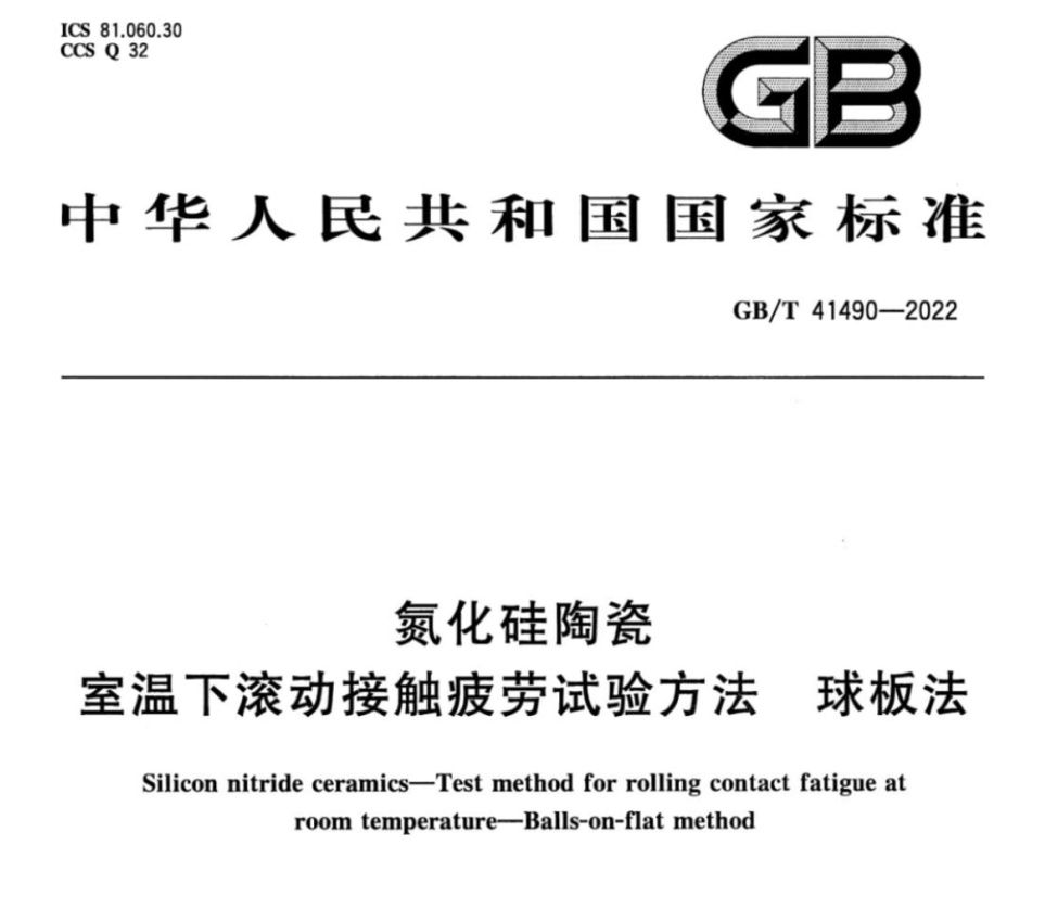 中國粉體網訊 11月1日起,《氮化硅陶瓷室溫 下滾動接觸疲勞試驗方法 球板法》(標準號GB/T41490-2022)在內的一批國家標準正式實施。國家標準《氮化硅陶瓷室溫下滾動接觸疲勞試驗方法球板法》主要起草單位為中材高新氮化物陶瓷有限公司、山東工業陶瓷研究設計院有限公司、合肥匯智新材料科技有限公司、江西工陶院精細陶瓷有限公司、浙江精久軸承工業有限公司、洛陽LYC軸承有限公司、山東國瓷功能材料股份有限公司、東阿海鷗鋼球有限公司、新疆晶碩新材料有限公司。