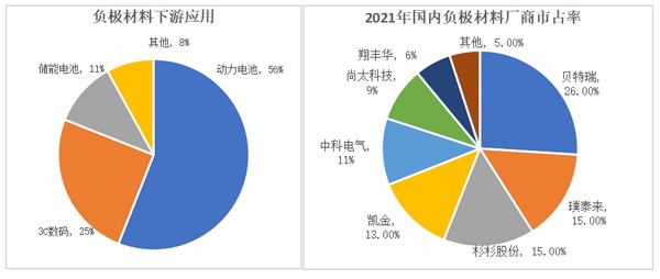 據(jù)高工產(chǎn)研鋰電研究所數(shù)據(jù)顯示,2021年鋰離子電池負(fù)極材料行業(yè)集中度較高,其中貝特瑞、璞泰來、杉杉股份、凱金在國內(nèi)的市場占有率分別為26%、15%、15%、13%,上述四家企業(yè)國內(nèi)市場占有率達(dá)到69%。負(fù)極材料下游主要運用為動力電池、儲能電池以及消費電池。其中,動力電池使用占56%。這主要是由于新能源汽車市場的快速擴張拉動鋰離子電池的需求量,導(dǎo)致負(fù)極材料出貨量的驟增。目前國內(nèi)負(fù)極材料企業(yè)產(chǎn)能共計約94萬噸,增長較快,但行業(yè)集中度還在不斷提高。