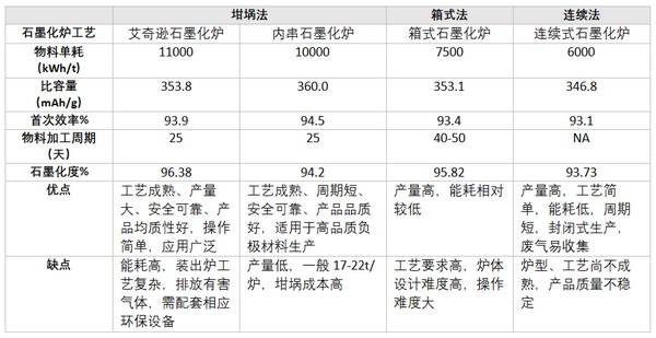 石墨化環(huán)節(jié)的高耗能主要來自石墨化工藝。目前,石墨化工藝分為三類,分別是坩堝法、箱式法和連續(xù)法。坩堝法為當(dāng)下普遍的石墨化工藝,代表企業(yè)包括杉杉股份、璞泰來等。坩堝法技術(shù)相對成熟,但坩堝法單位能耗較高且存在環(huán)保問題。而箱式石墨化爐與連續(xù)式石墨化爐在單位能耗上優(yōu)勢明顯。但目前連續(xù)式石墨化爐工藝尚不成熟,離商業(yè)化還有較長距離。箱式石墨化工藝在少數(shù)行業(yè)企業(yè)發(fā)展較好,代表企業(yè)為河北坤天新能源股份有限公司,坤天新能源利用多年使用箱式爐積累的經(jīng)驗,自主設(shè)計、組裝爐體結(jié)構(gòu),不斷優(yōu)化工藝、提升能效,并實現(xiàn)高品質(zhì)負(fù)極材料的持續(xù)量產(chǎn)。但是箱式石墨化爐工藝門檻較高,對企業(yè)在爐體設(shè)計、操作以及技術(shù)上均有著較高要求,因此真正掌握的企業(yè)非常有限。