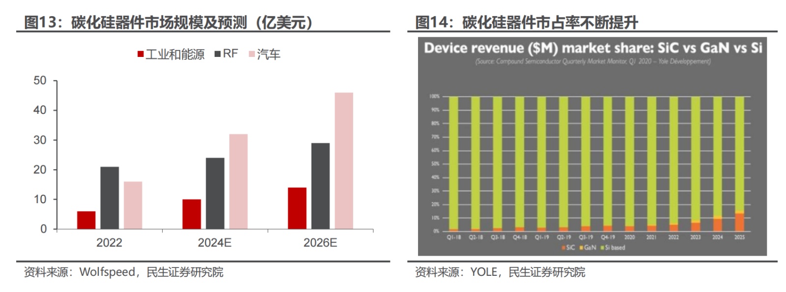 根據碳化硅行業全球龍頭廠商Wolfspeed的預測,受新能源汽車及發電、電源設備、射頻器件等需求驅動,2026年碳化硅器件市場規模有望達到89億美元,其中用于新能源汽車和工業、能源的SiC功率器件市場規模為60億美元。根據YOLE的預測,碳化硅的市占率有望在2024年突破10%。