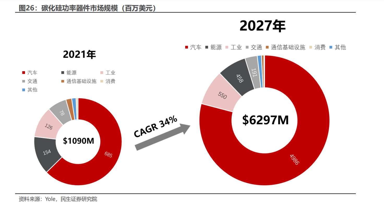 新能源汽車是碳化硅功率器件下游第一大應用市場,根據民生證券測算,2026年全球應用于新能源汽車主驅逆變器的SiC器件市場規模有望達44億美元。為了提升電動汽車充電速度、緩解里程焦慮,小鵬、比亞迪、長城等整車廠陸續推出800V高壓平臺車型,有望推動SiC器件在新能源汽車中滲透率進一步提升。