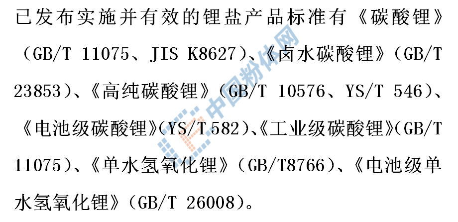 在研鋰鹽產品類標準有鋰(英文版)、單水氫氧化鋰(英文版)、粗碳酸鋰、鋰單位產品能源消耗限額、氫氧化鋰單位產品能源消耗限額。