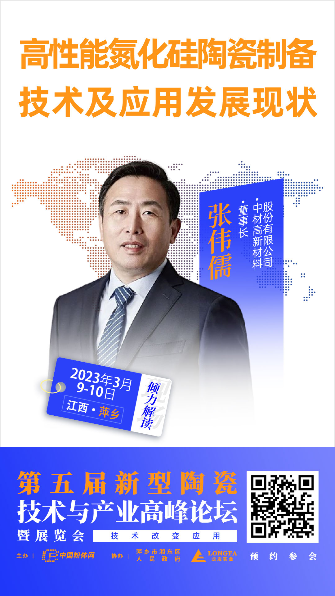 2023年3月9-10日,中國粉體網將在江西萍鄉舉辦“2022第五屆新型陶瓷技術與產業高峰論壇”,我們有幸邀請到了中材高新材料股份有限公司董事長張偉儒先生作題為《高性能氮化硅陶瓷制備技術及應用發展現狀》的報告,屆時,張總將對氮化硅陶瓷的制備技術進行詳細闡述,并對其應用前景進行展望。