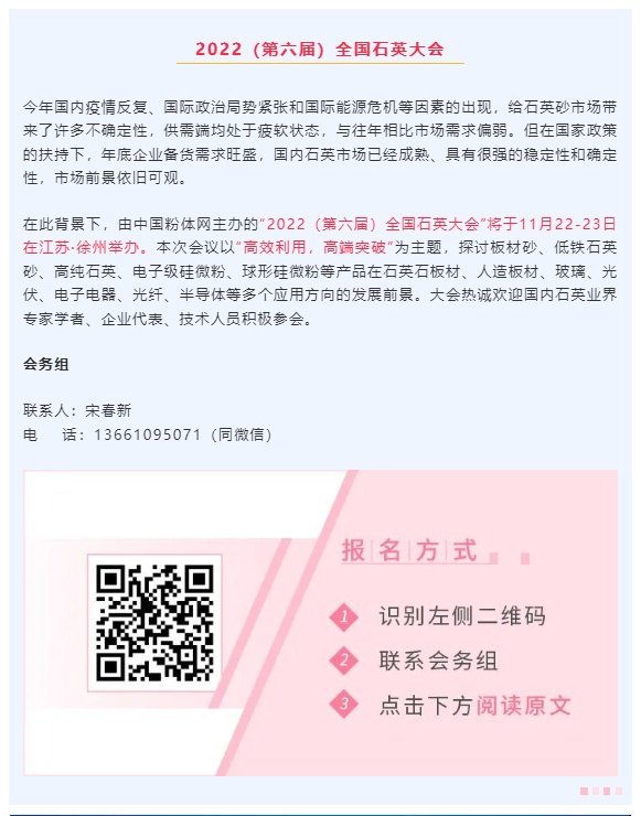 由中國粉體網主辦的“2022(第六屆)全國石英大會”將于11月22-23號在江蘇·徐州舉辦,蘄春九棵松宏泰石英砂廠邀您一同參加。