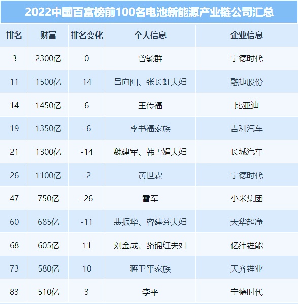 據(jù)統(tǒng)計,2022胡潤百富榜前100名中,寧德時代、融捷股份、比亞迪、吉利汽車、長城汽車、小米集團、天華超凈、億緯鋰能、天齊鋰業(yè)9家電池新能源產(chǎn)業(yè)鏈企業(yè)、11人上榜,財富總額超1.21萬億。