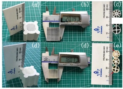近日,中國科學(xué)院上海高等研究院唐志永研究員和張潔副研究員帶領(lǐng)的工程科學(xué)研究組在復(fù)雜結(jié)構(gòu)氧化釓陶瓷方面取得進(jìn)展,首次實現(xiàn)了復(fù)雜結(jié)構(gòu)氧化釓(Gd2O3)陶瓷材料的增材制造。研究人員利用DLP面曝光技術(shù),通過對陶瓷漿料系統(tǒng)的折射率匹配以及流變學(xué)研究,探究出了一種同時具備高流變性能和固相負(fù)載量的漿料體系應(yīng)用于3D打印。對打印過程的曝光時間、強(qiáng)度以及層厚等影響因素綜合研究得出了較優(yōu)的匹配條件,并成功連續(xù)制備了超長(10 cm)超薄(0.3 mm)的復(fù)雜晶格結(jié)構(gòu)中子吸收器。