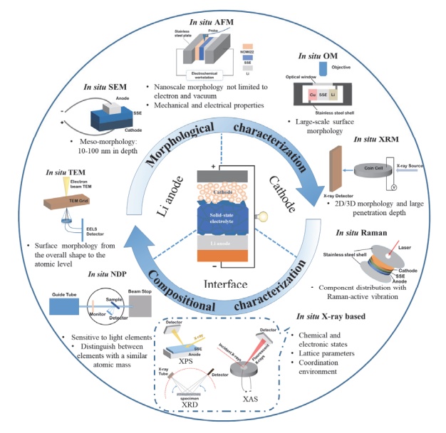 圖1固態(tài)鋰電池電極過程的原位表征技術(shù)示意圖