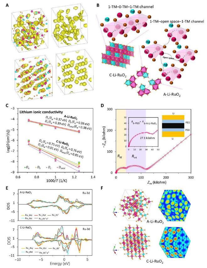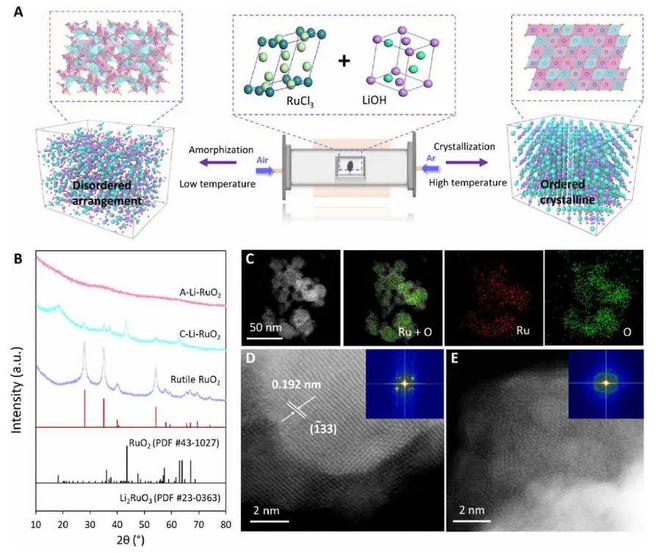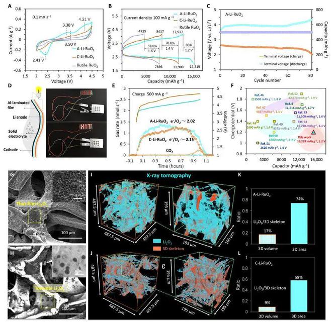 基于上述挑戰(zhàn),王家鈞教授團(tuán)隊(duì)首次提出通過調(diào)節(jié)晶相結(jié)構(gòu)修飾局域電子——離子傳輸行為,構(gòu)筑具有獨(dú)特結(jié)構(gòu)的SSC目標(biāo),采用低溫?zé)崽幚矸椒ㄖ苽淞司哂虚L程無序結(jié)構(gòu)的非晶釕酸鋰(A-Li-Ru-O)復(fù)合材料,團(tuán)隊(duì)發(fā)現(xiàn)該材料可以顯著提升電子、離子傳輸動(dòng)力學(xué),并結(jié)合理論計(jì)算得出,非晶結(jié)構(gòu)中的多維擴(kuò)散有助于其電子、離子傳輸行為。團(tuán)隊(duì)通過進(jìn)一步研究發(fā)現(xiàn),擔(dān)載非晶釕酸鋰(A-Li-Ru-O)的SSLOB器件展現(xiàn)了優(yōu)異的放電比容量和循環(huán)性能,基于同步輻射X射線吸收譜、同步輻射X射線斷層成像等技術(shù)研究得出,該無序材料除了具有高效的離子、電子傳輸動(dòng)力學(xué),還可以在充放電過程中分別加速過氧化鋰(Li2O2)的分解和超氧化鋰(LiO2)的電化學(xué)轉(zhuǎn)化。