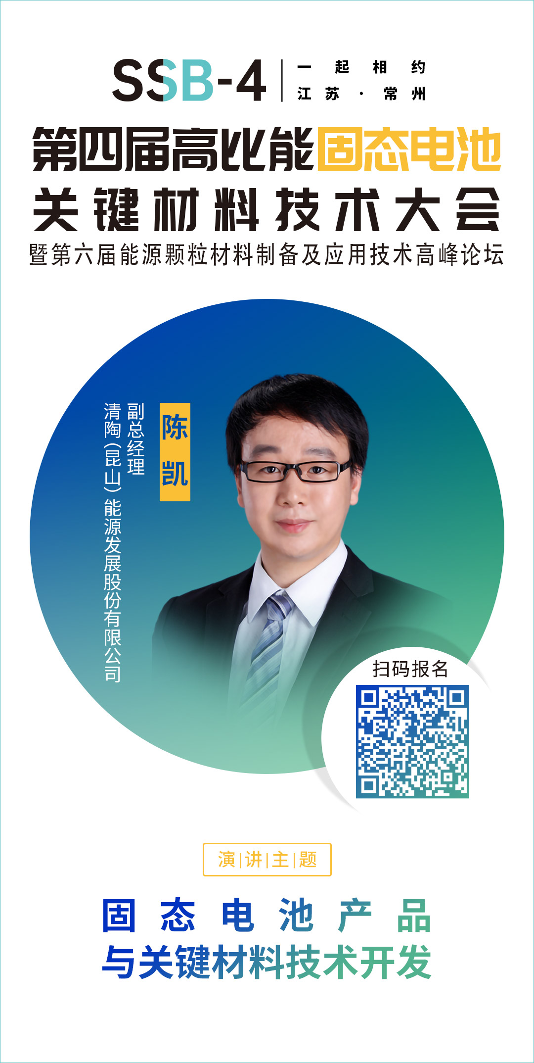 針對固態(tài)電池相關(guān)的技術(shù)、材料、市場及產(chǎn)業(yè)等方面的問題,中國粉體網(wǎng)將在常州舉辦第四屆高比能固態(tài)電池關(guān)鍵材料技術(shù)大會,為致力于固態(tài)電池技術(shù)開發(fā)的企業(yè),科研院校,以及電動車、儲能、特種應(yīng)用等終端企業(yè)提供信息交流的平臺,開展產(chǎn)、學(xué)、研合作,共同推動行業(yè)發(fā)展。屆時,清陶(昆山)能源發(fā)展股份有限公司副總經(jīng)理陳凱博士將作題為《固態(tài)電池產(chǎn)品與關(guān)鍵材料技術(shù)開發(fā)》的報告。報告將介紹清陶公司固態(tài)電池的技術(shù)路線,展示固態(tài)電池的產(chǎn)品性能和產(chǎn)業(yè)化進(jìn)展,并從實際產(chǎn)品應(yīng)用角度,分析固態(tài)電池對正負(fù)極材料、固態(tài)電解質(zhì)材料等關(guān)鍵材料的技術(shù)開發(fā)需求。