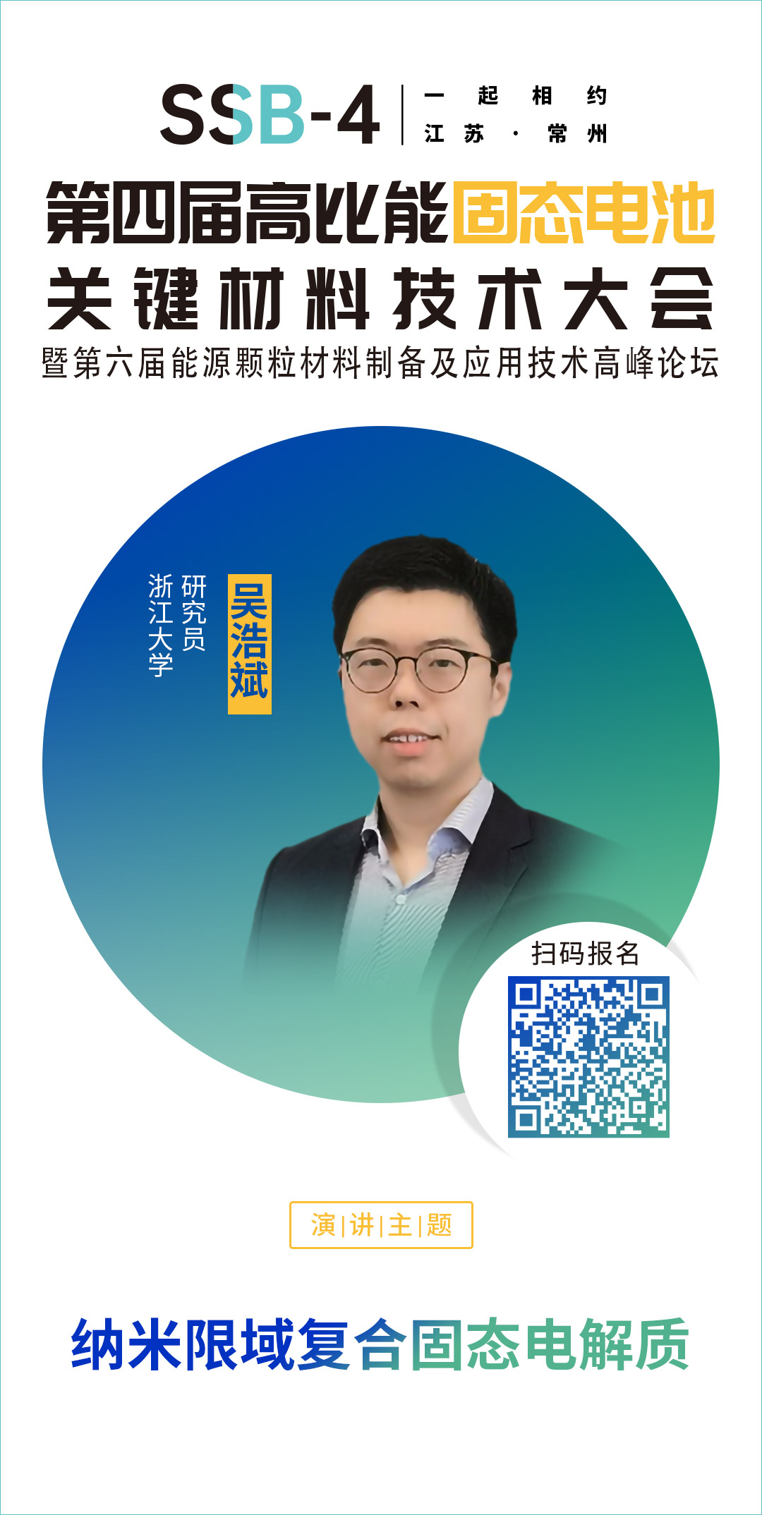 針對固態電池相關的技術、材料、市場及產業等方面的問題,中國粉體網將在常州舉辦第四屆高比能固態電池關鍵材料技術大會。為致力于固態電池技術開發的企業,科研院校,以及電動車、儲能、特種應用等終端企業提供信息交流的平臺,開展產、學、研合作,共同推動行業發展。屆時,浙江大學吳浩斌研究員將作題為《納米限域復合固態電解質》的報告。報告將重點介紹他們團隊基于金屬-有機框架等新型功能多孔材料,設計制備一系列納米孔限域電解液的固液復合和準固態電解質材料,利用孔道結構的功能位點和空間效應調控電解液的離子輸運、局部結構和反應活性等物理化學性質,在維持室溫高離子電導率的同時提升鋰離子遷移數,并成功用于構建高能量密度鋰金屬電池。
