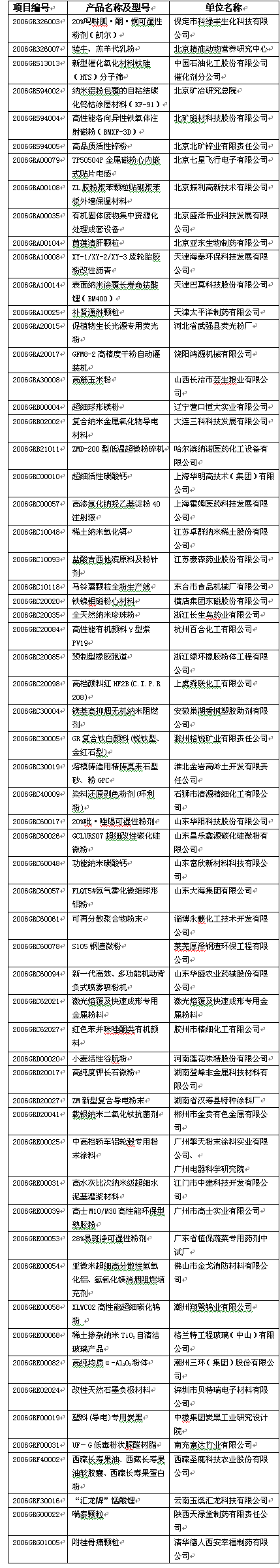 列入2006年度國家重點產品計劃的粉體項目如下:
