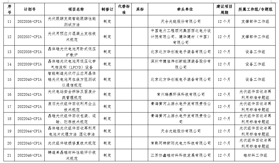 2022年第三批光伏協(xié)會標(biāo)準(zhǔn)制修訂計劃項目匯總表