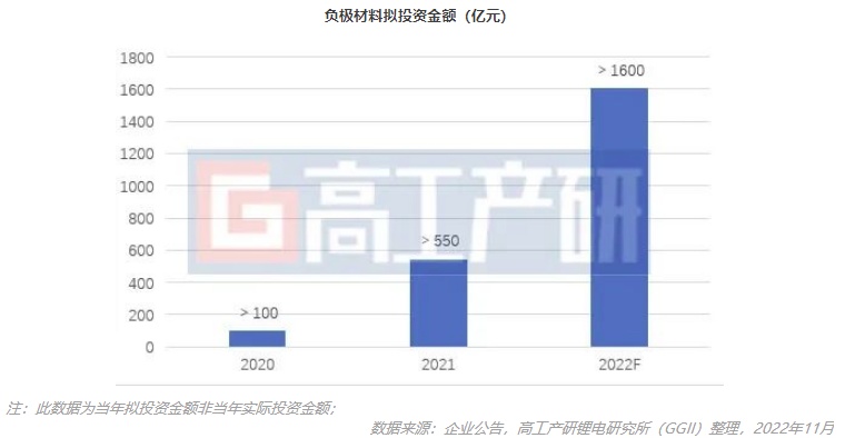 中國粉體網(wǎng)訊 據(jù)高工產(chǎn)業(yè)研究院(GGII)不完全統(tǒng)計,2020-2022年中國負(fù)極材料項目擬投資金額超2200億元,其中2021年擬投資金額超550億元,2022年擬投資金額超1600億元,同比增長超200%。主要因為2021年市場需求暴漲,導(dǎo)致石墨化產(chǎn)能緊缺,于是企業(yè)加速投資擴產(chǎn),行業(yè)外企業(yè)也不斷涌入。