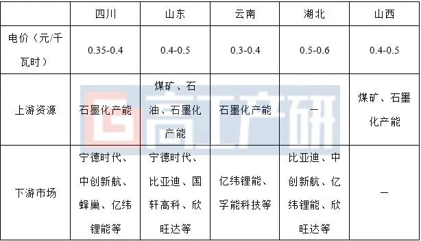 2020-2022年負(fù)極材料擬新建產(chǎn)能規(guī)模排在前五的省份是四川、山東、云南、湖北、山西,合計近400萬噸,主要原因是: